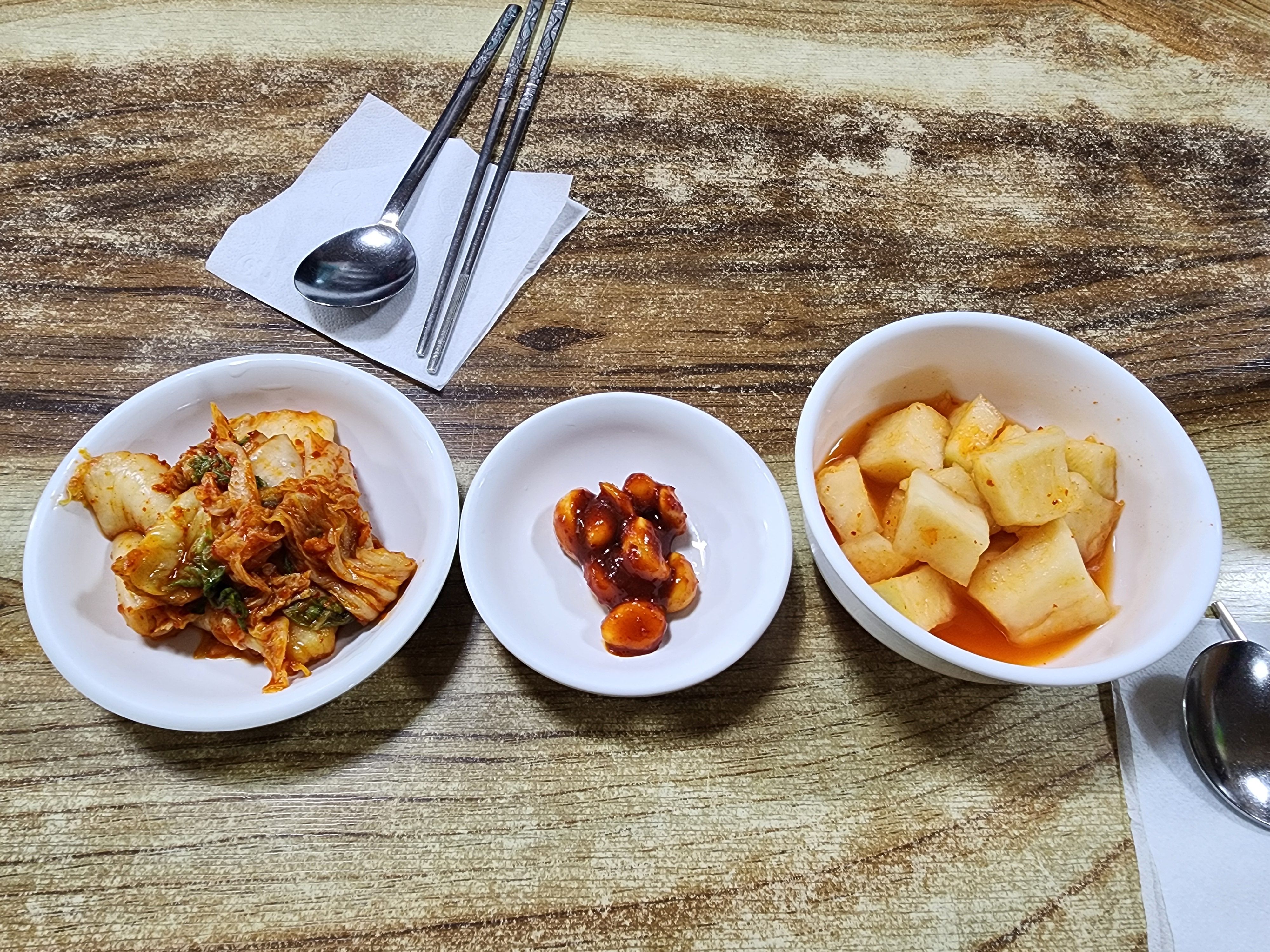 밑반찬으로는 배추김치, 양념된 통마늘, 깍두기가 나와요.