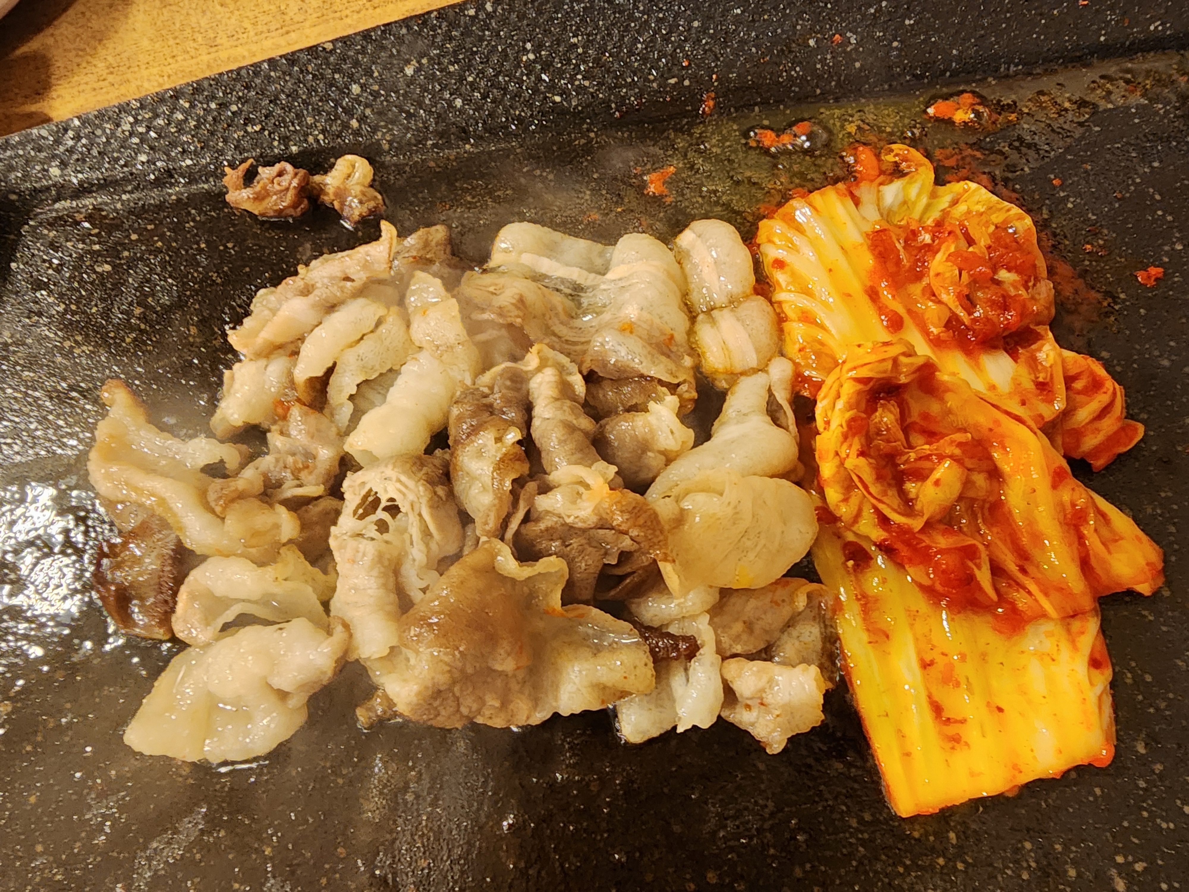 대패삼겹살+김치+파채를 불판에 한 번에 올리고